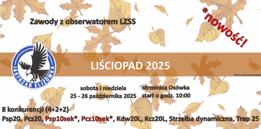 W weekend, 25-26 października 2025 zapraszamy serdecznie na ostatnie w tym roku zawody z kalendarza LZSS na naszej strzelnicy w Osówce, czyli LIŚCIOPAD 2025.Przewidziano 8 konkurencji:Sobota, 25.10.2025: Psp20, Pcz20, Psp10sek, Pcz10sek i Strzelba Dynamiczna (tylko […]